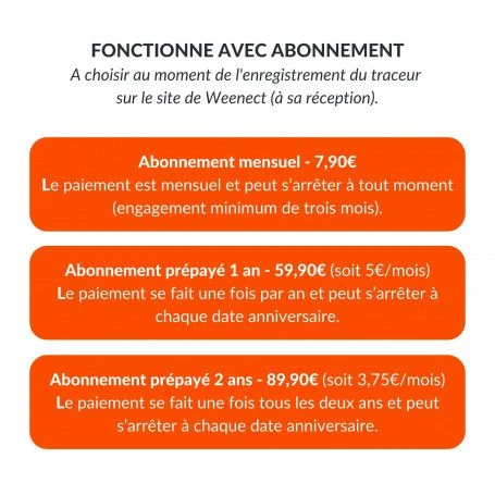 Abonnement requis : Le traceur obtient sa position GPS grâce à des satellites, puis l’envoie à nos serveurs grâce au réseau téléphonique. Il est équipé d’une carte SIM (incluse dans le produit), ce qui explique qu’il fonctionne avec abonnement. Cet abonnement se choisit au moment de l’enregistrement du traceur (à sa réception) sur le site de Weenect.