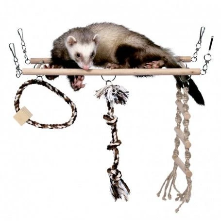 - Et de cette échelle pendent une échelle en corde, un anneau en corde et un jeu en corde avec pièce en bois.