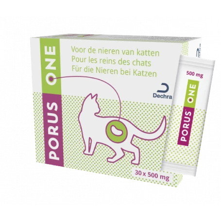 Porus One est un produit pour les reins du chat. Porus One intercepte les précurseurs des toxines urémiques (= toxines rénales) au site de leur production dans l’intestin et les élimine avec les excréments. Ce faisant, toutes les billes de Porus One sont complètement éliminées. Porus One n’est pas métabolisé et, par conséquent, il ne sollicite pas le métabolisme du chat.