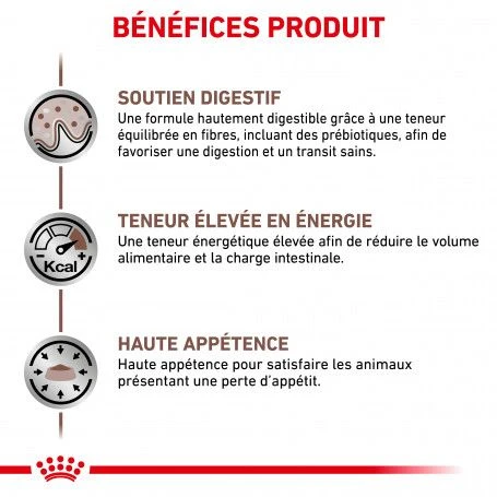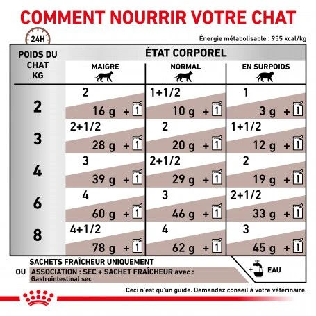 Le plus : Les sachets repas Royal Canin Cat gastro Intestinal favorisent la reprise de poids pendant la période de convalescence.