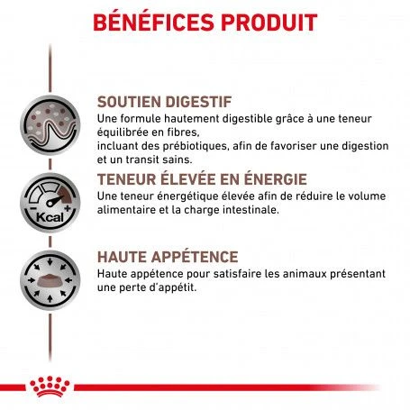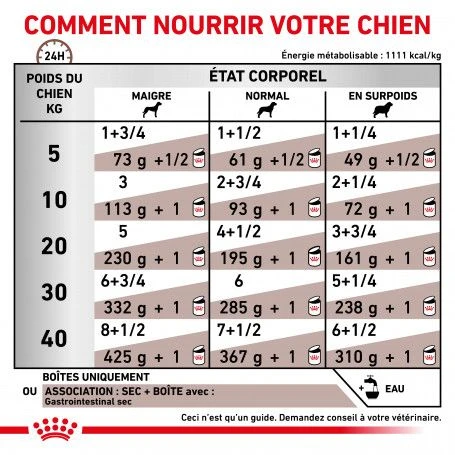 La boîte Dog Gastro Intestinal Royal Canin est destiné à la prise en charge nutritionnelle d’une maladie. Veuillez consulter votre vétérinaire avant utilisation.