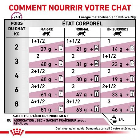 Les sachets repas Veterinary Health Nutrition Cat Renal Boeuf sont destinés à la prise en charge nutritionnelle d’une maladie du chat. Veuillez consulter votre vétérinaire avant utilisation.